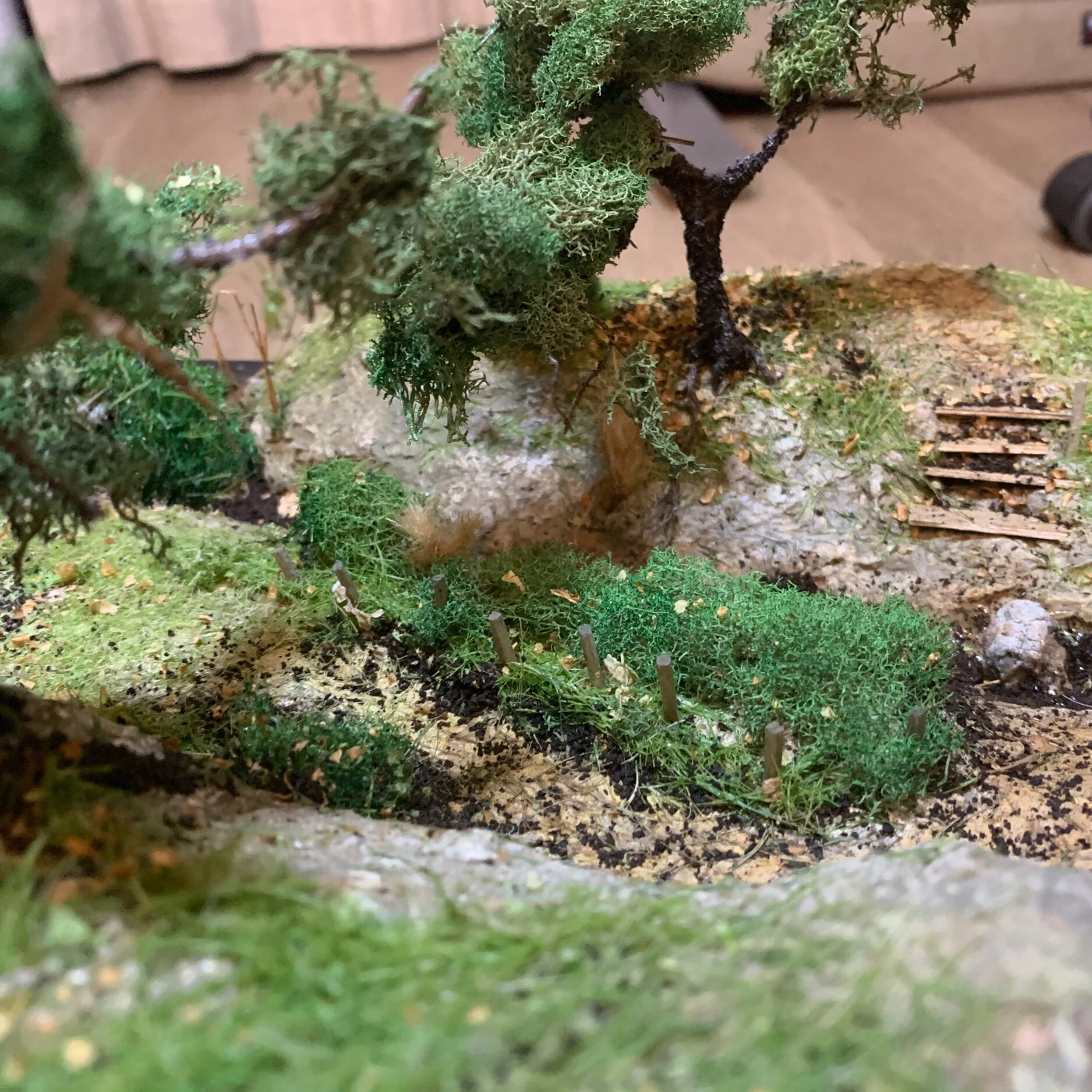 The trees were mounted with PVA glue and a UV resin. one tree extending a wire traveling root to drink from the creek. Rich soil and piles of leaves added liberally around the model.